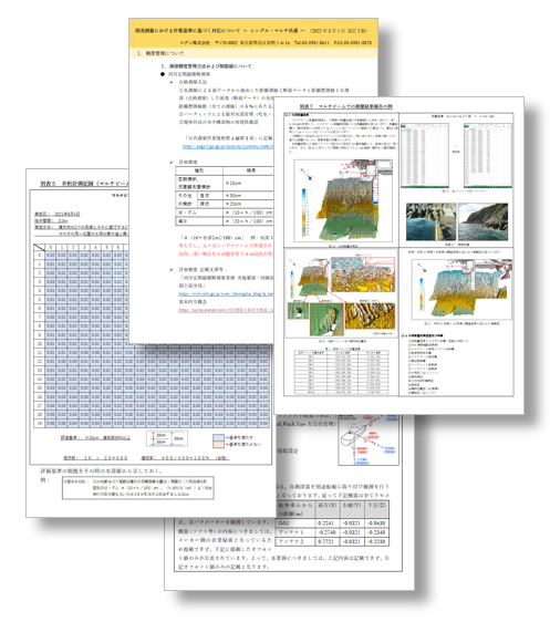 マルチ・シングルソナーを用いた深浅測量の作業マニュアルをまとめました。提出する必要のある書類の例示と共にその考え方をまとめました。 |